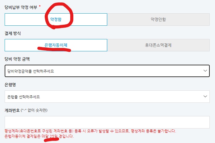 은행자동이체를 선택하면 매달 25일이 결제일입니다.
