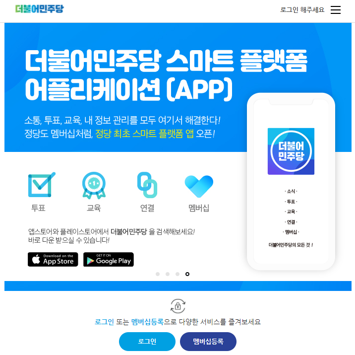 더불어민주당의 스마트 플랫폼 어플리케이션(앱)도 소통과 각종 정보 공유, 참여를 위해 운영되고 있습니다.