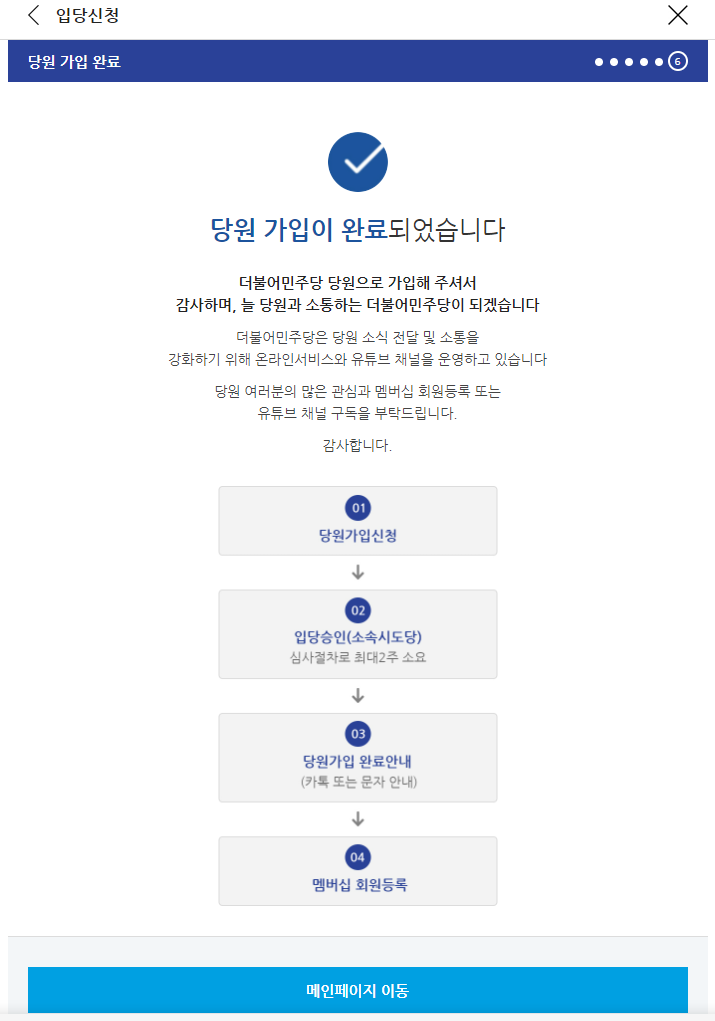 그 자리에서 당원가입 신청이 완료 되었습니다.