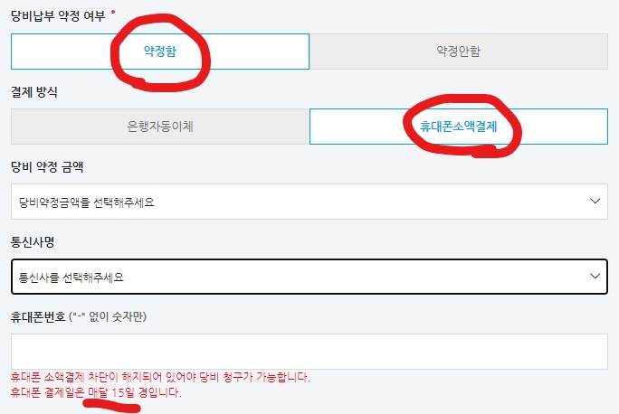 휴대폰 소액결제를 선택하면 매달 결제일이 15일이니 참고하시기 바랍니다.