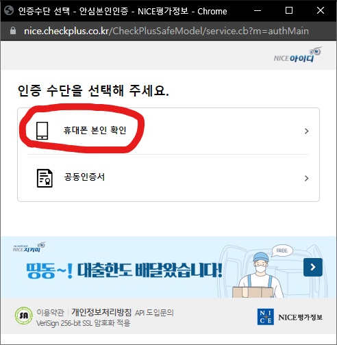 휴대폰 본인 확인과 공동인증서(은행전용 인증서는 사용 불가) 중에 선택하여 본인확인 절차를 진행합니다.