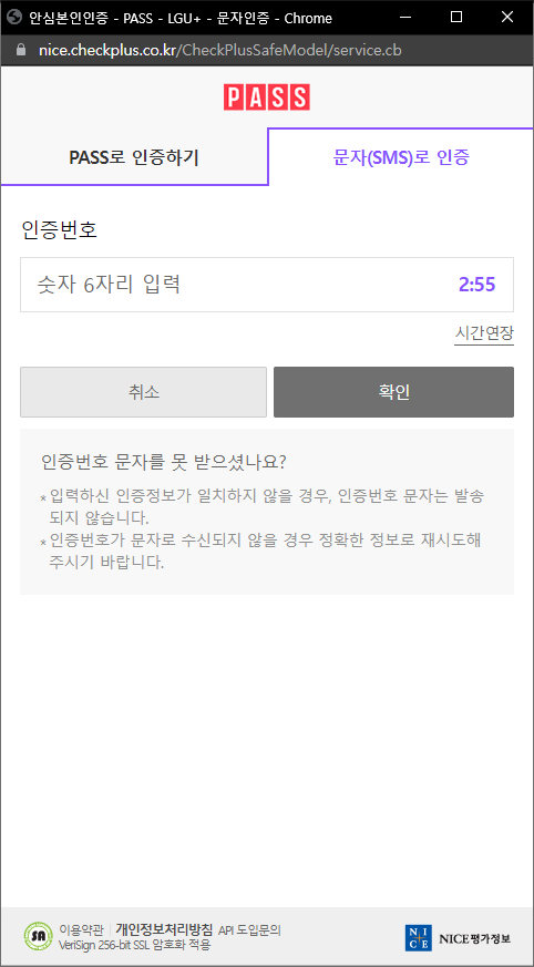 문자로 온 인증번호 6자리를 정확하게 입력한 후 확인을 선택합니다.
