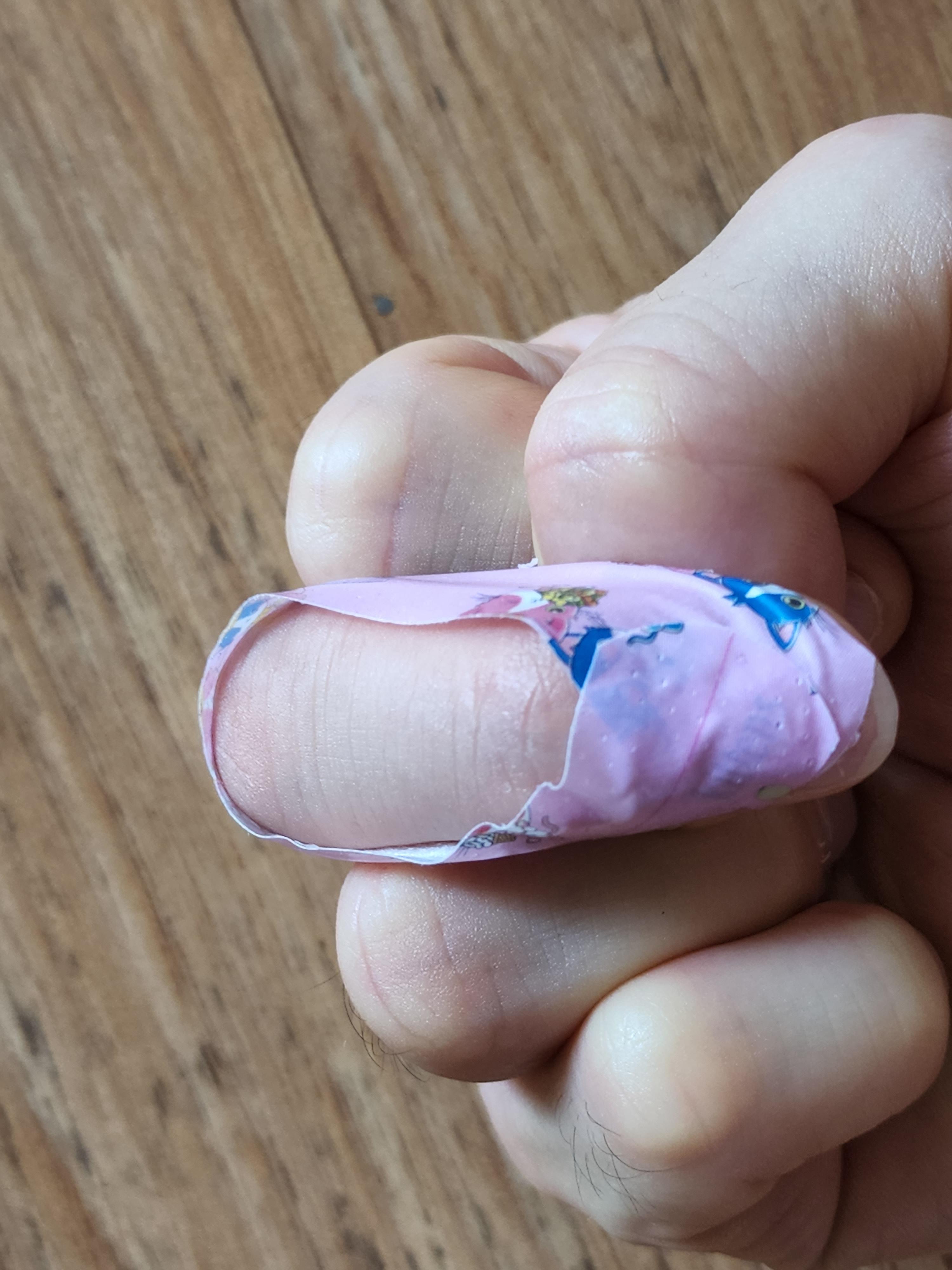 밴드로 손가락 두번째 마디에서 손톱까지 손가락 옆면을 붙여 손가락이 펴지지 않도록 고정하면 되겠다 싶었습니다.