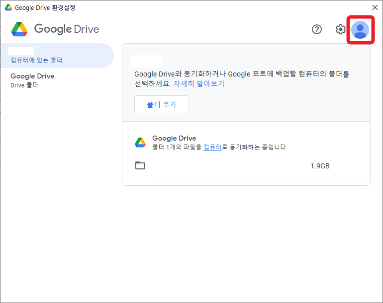 구글 드라이브 환경설정 창에서 계정 아이콘을 클릭하면 기존에 로그인된 구글 드라이브 계정이 나타납니다.