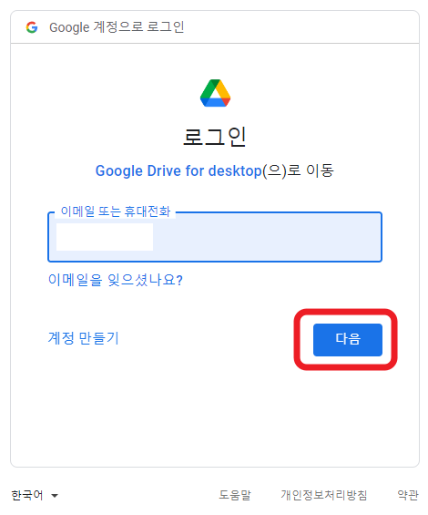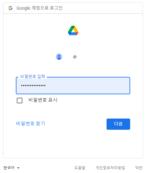 추가하기 원하는 데스크탑용 구글 드라이브의 계정에 맞는 비밀번호를 정확하게 입력한 후 다음을 클릭합니다.