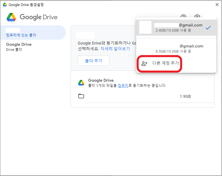 이미 데스크탑용 구글 드라이브 계정을 2개 사용 중입니다.
