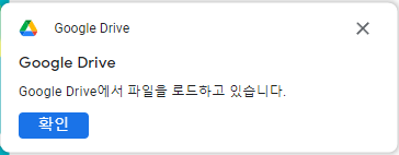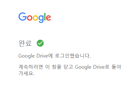 위 안내창에서 '다시 시도'를 클릭하여 구글 드라이브 계정과 계정에 해당하는 로그인 암호를 입력하면 인증 상태창으로 구글 드라이브에 로그인했다는 반가운 알림 메시지를 볼 수 있습니다.