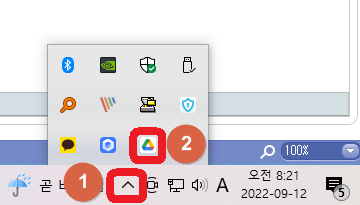 숨겨진 아이콘 표시를 클릭하고 기존 구글 드라이브 실행 아이콘을 클릭합니다.