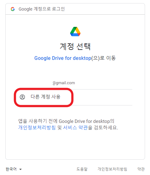 데스크톱용 구글 드라이브 계정을 추가하기 위해 '다른 계정 사용'을 선택합니다.