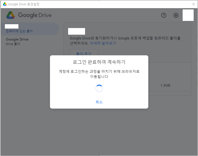 데스크톱용 구글 드라이브 계정 추가가 완료되어 파일 로드가 곧바로 시작되었음을 알 수 있습니다.
