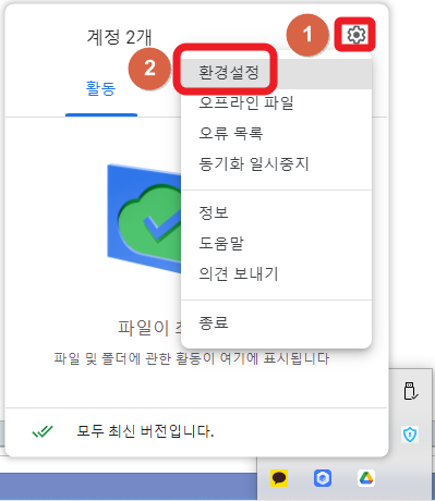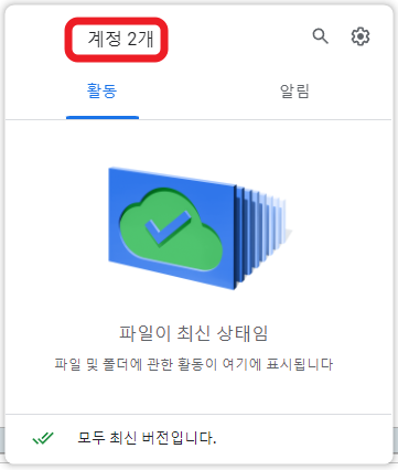 기존에 구글 드라이브 계정 2개가 실행 중임과 파일 동기화 상태를 확인할 수 있습니다.