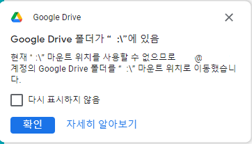 기존의 드라이브 위치를 사용할 수 없어 새로운 드라이브로 마운트 위치로 이동하여 사용한다는 알림창입니다.