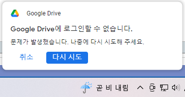 하지만 아쉽게도 작업 중이던 새로운 구글 드라이브 계정 연결은 아래 오류 메시지와 함께 중단이 되었습니다.
