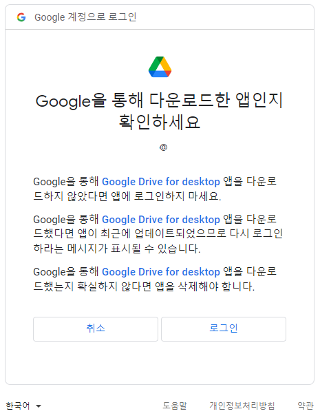 데스크톱용 Google Drive 프로그램 파일을 설치하지 않은 컴퓨터에서는 설치과정을 추가하면 되겠습니다.