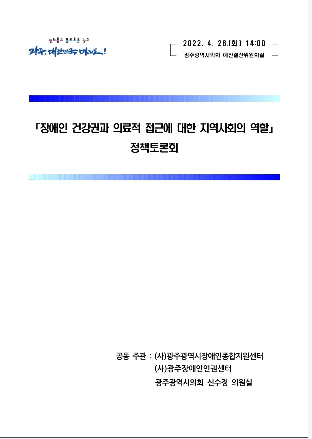 아래는 광주광역시의회가 업로드한 '장애인 건강권과 의료적 접근에 대한 지역사회의 역할' 토론회 전체 영상 링크입니다.