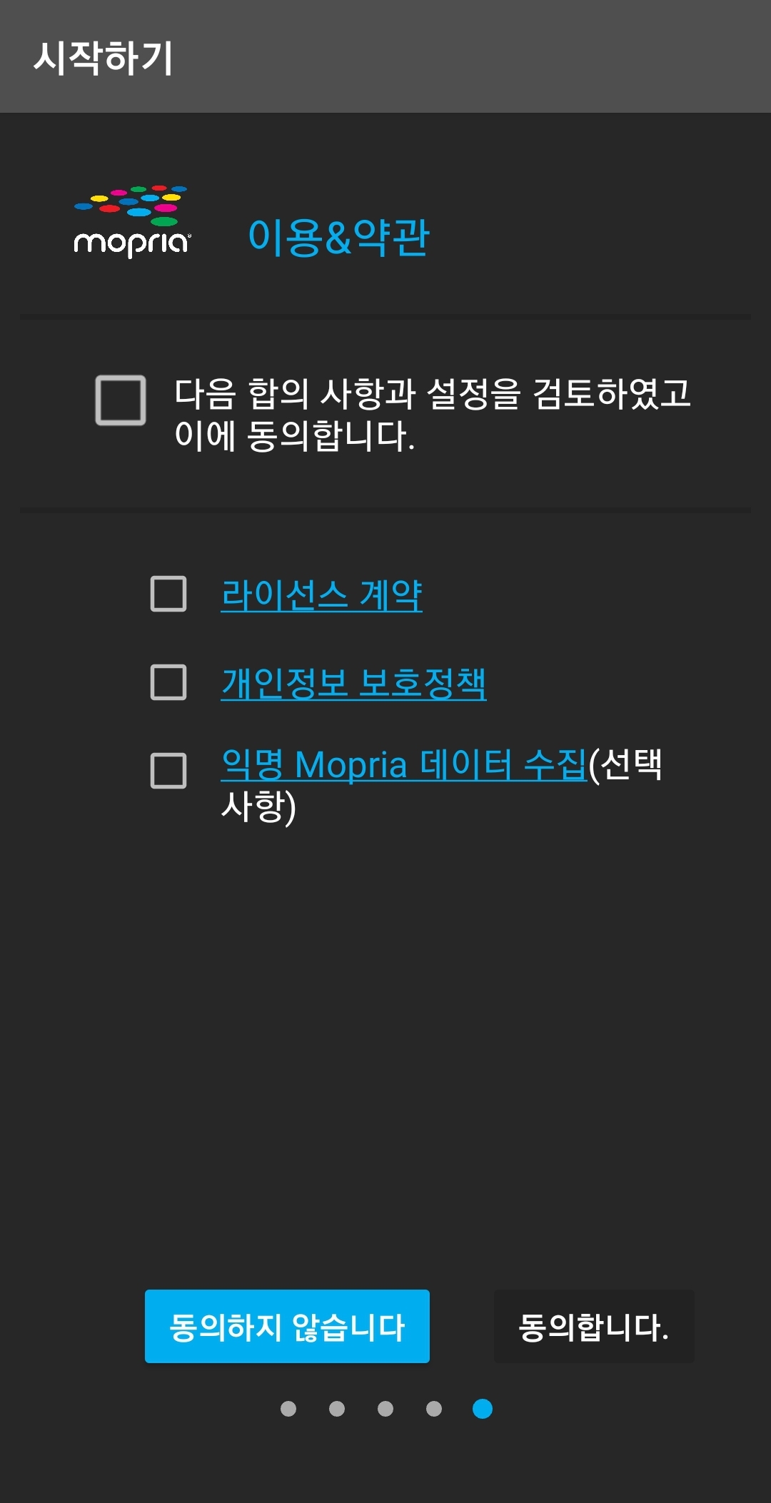 모프리아앱 소개 다섯 번째 페이지는 이용 약관을 소개하는 링크와 라이센스 계약에 관한 링크, 개인정보 보호정책, 그리고 익명으로 모프리아 앱 사용에 관한 데이터 수집 동의여부를 묻는 페이지입니다.