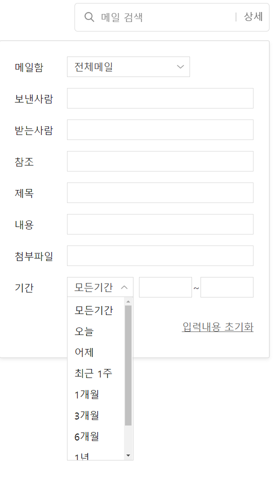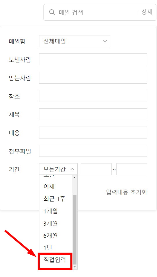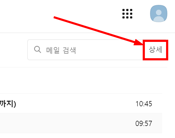 이메일에 접속하여 열린 화면을 찬찬히 살펴보면 오른쪽 위쪽에 아래 이미지에서 보이는 '메일 검색 상세' 검색 입력 네모 박스가 보일 것입니다.