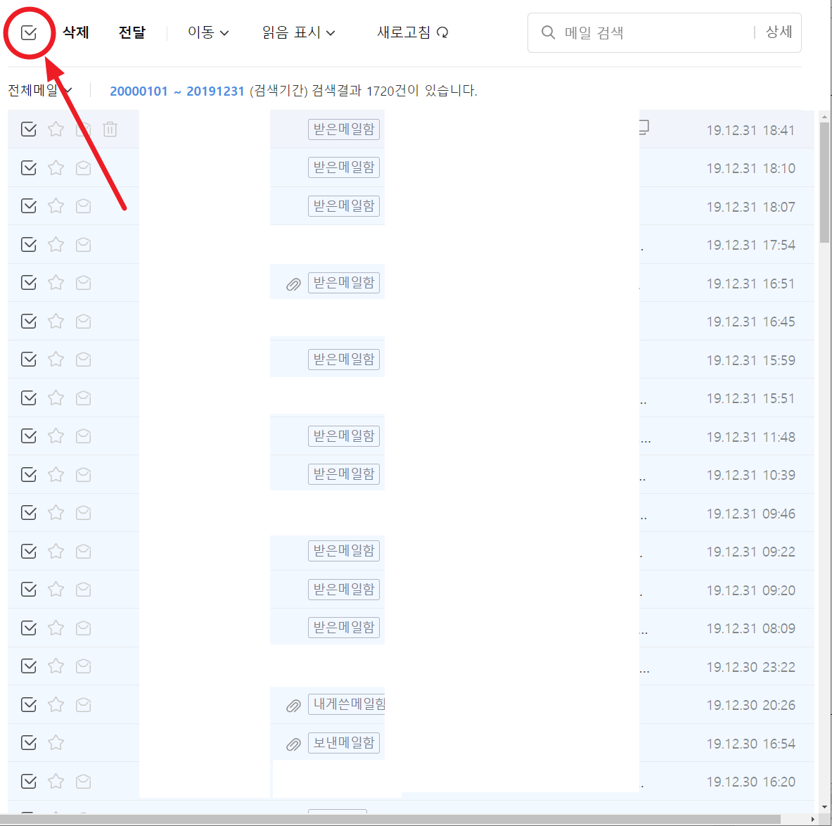 왼쪽 위 전체 이메일 선택 아이콘을 선택하면 화면에 불러와진 100개의 이메일이 동시에 선택이 됩니다.