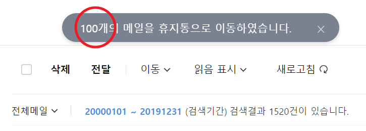 '100개의 메일을 휴지통으로 이동하였습니다.'