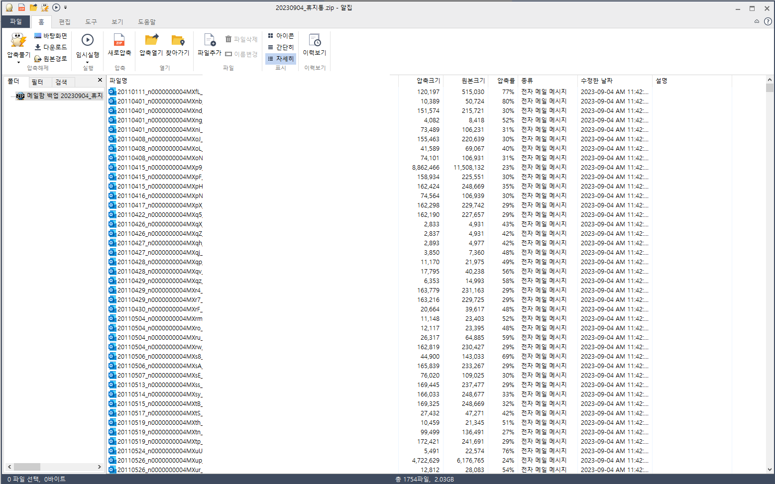압축파일로 다운로드된 이메일을 압축프로그램으로 살펴본 모습입니다.