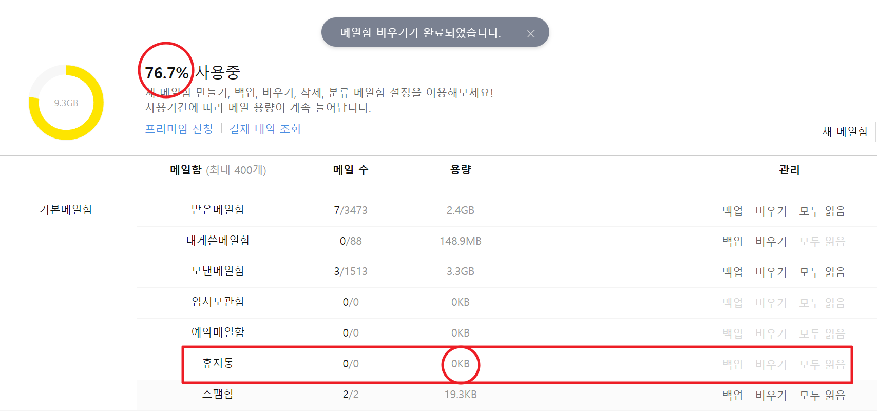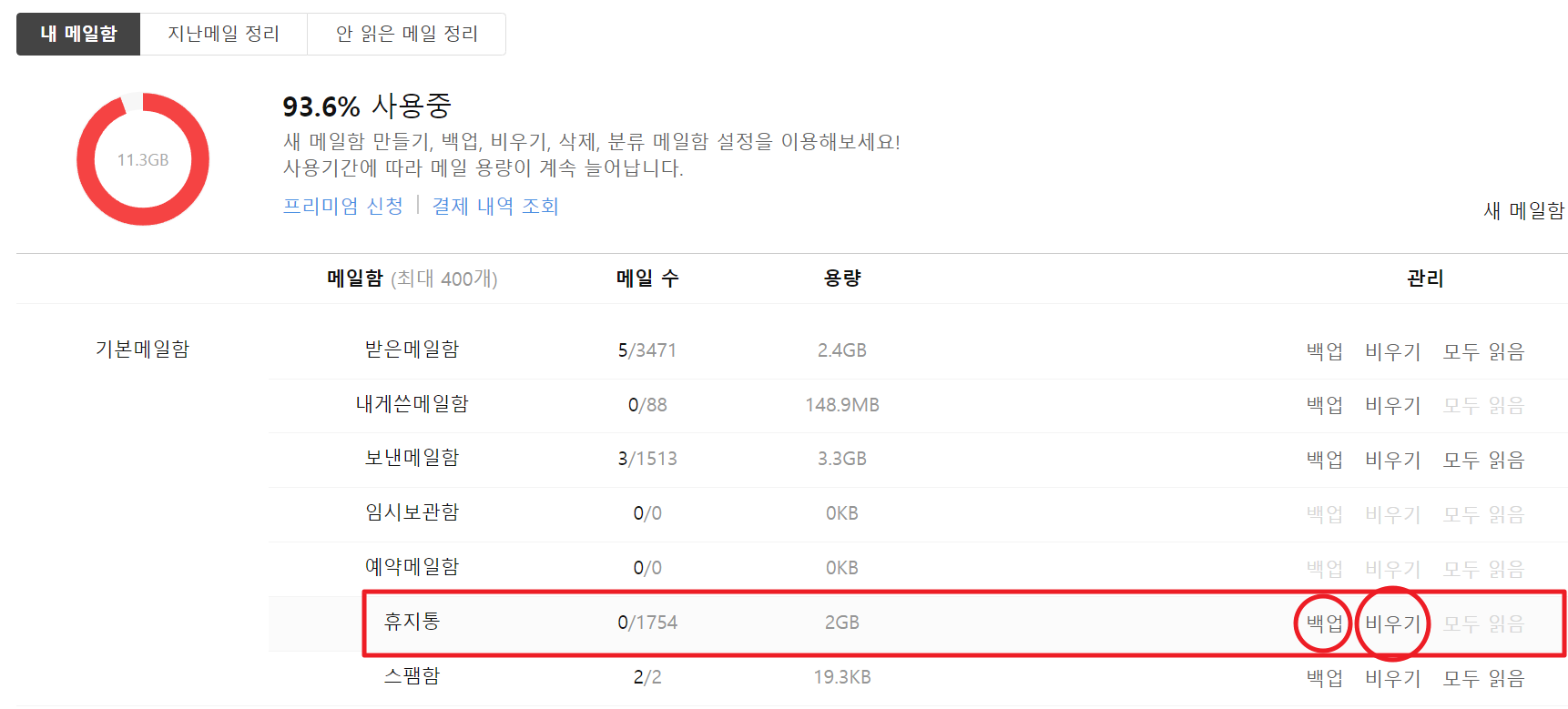 이제 설정 > 메일함관리 > 내 메일함으로 이동하여 휴지통을 백업한 후 휴지통을 비우기하면 끝입니다.