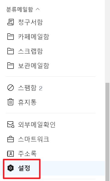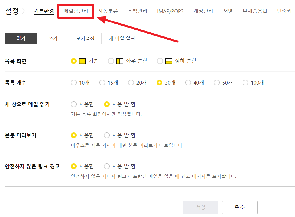 설정화면에서 두 번째 메뉴 '메일함관리'를 선택합니다.