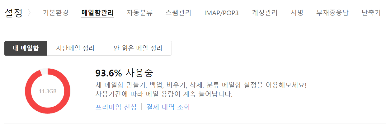 최근에 이메일 설정을 보기 위해 들어갔다가 용량이 거의 다 찼음을 알게 되었습니다.