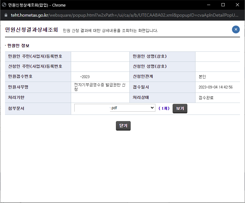위 화면은 전자기부금영수증 발급 권한 신청 민원이 처리 완료되어 민원처리결과조회 화면에서 보여지는 모습입니다.
