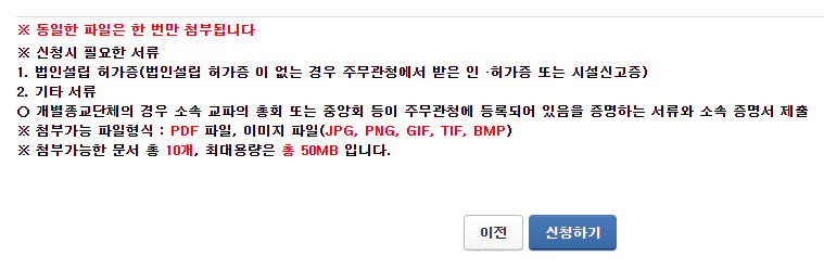 필요한 과정을 마쳤다면 다시 한 번 오류가 없는지 확인하고 신청하기 버튼을 누르면 일단 전자기부금영수증 발급권한 신청은 끝납니다.