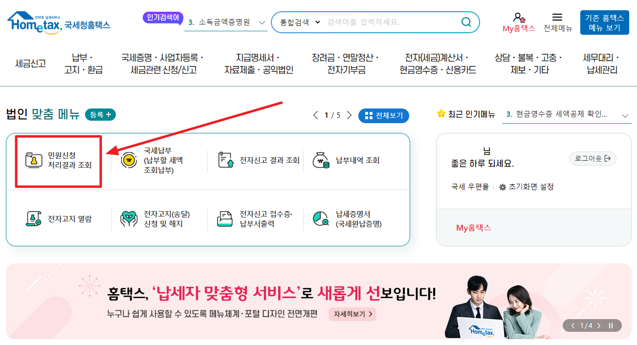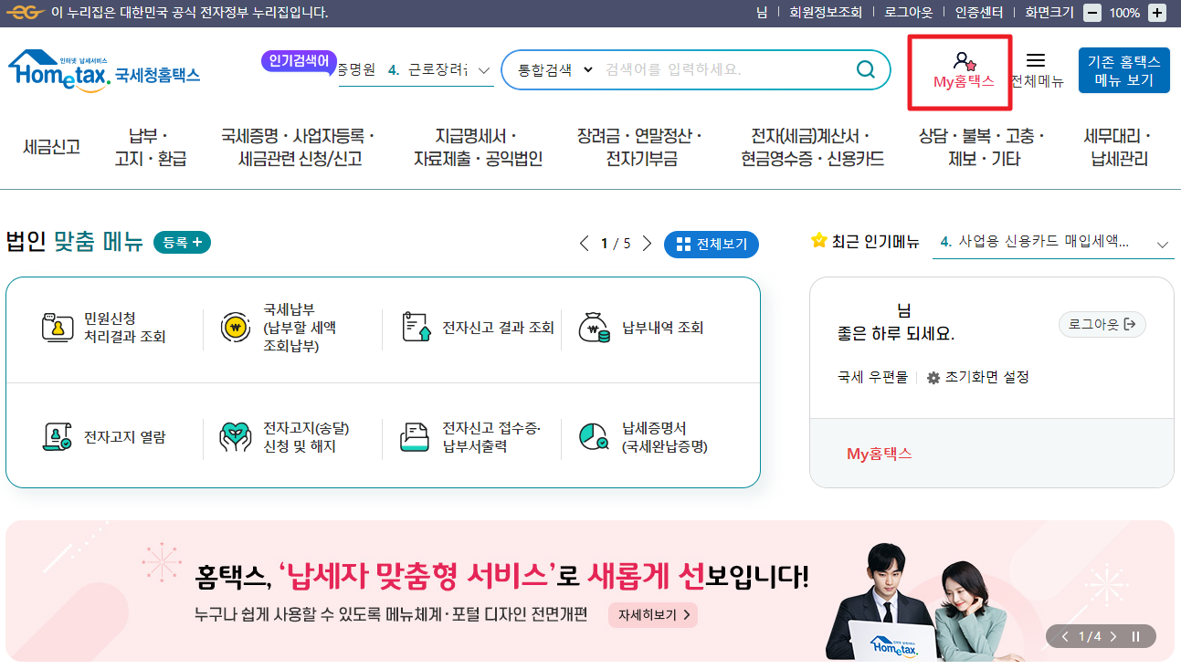 다시 돌아와 국세청홈텍스 첫 화면입니다.