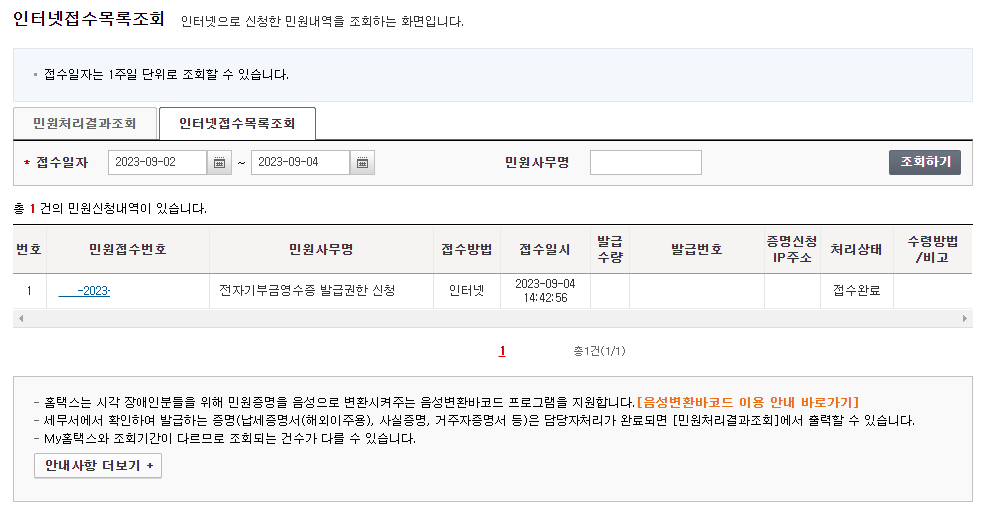 인터넷접수목록조회 화면에 민원접수번호와 민원사무명, 접수방법, 접수일시 등의 정보를 확인할 수 있습니다.