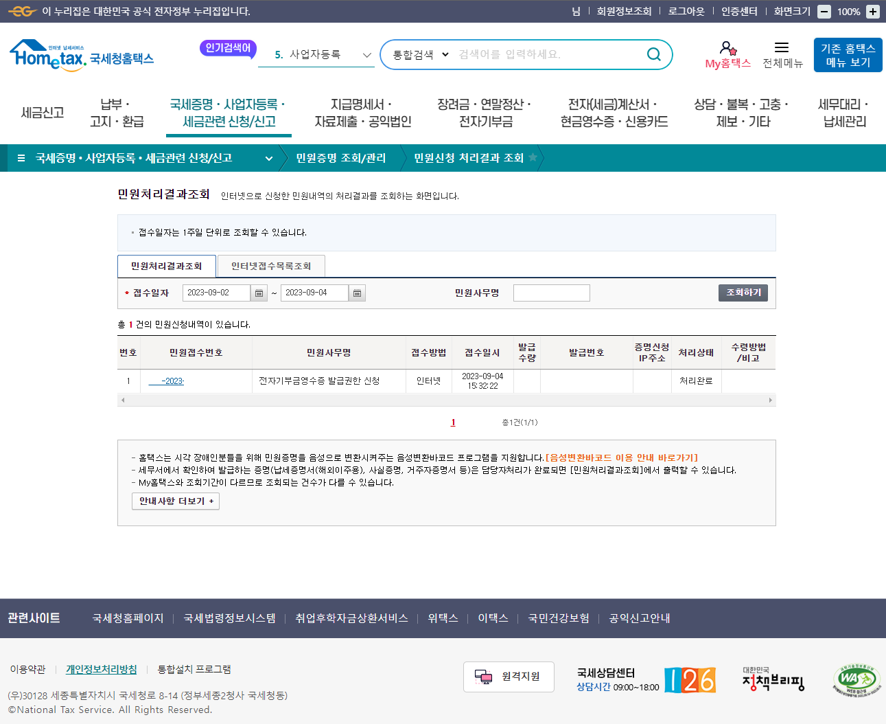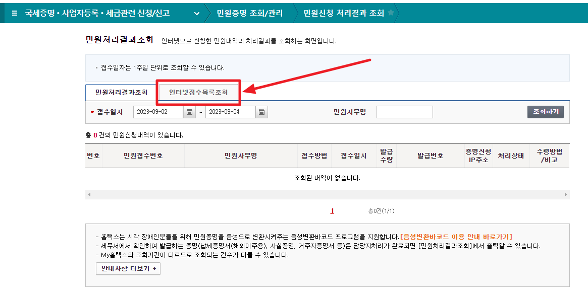 신청한 지 어느 정도의 시간이 지나서 처리가 되었다면 민원처리결과조회 메뉴 화면에 신청했던 내역이 보일 것입니다만, 바로 직전에 신청한 상태인지라 인터넷접수목록조회 메뉴로 들어가보면 신청한 내역이 나타납니다.