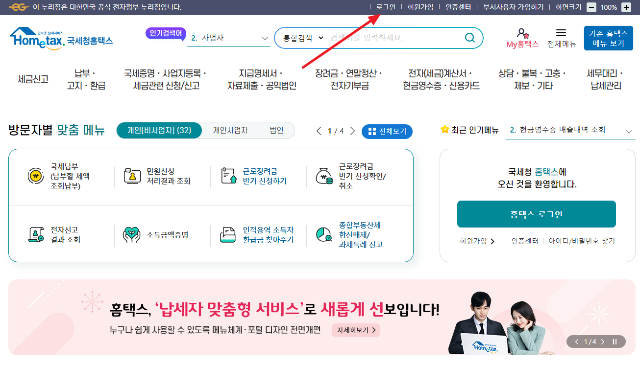 국세청 홈텍스 첫 화면 상단 메인 메뉴 중 '로그인' 메뉴를 선택하여 로그인을 진행합니다.