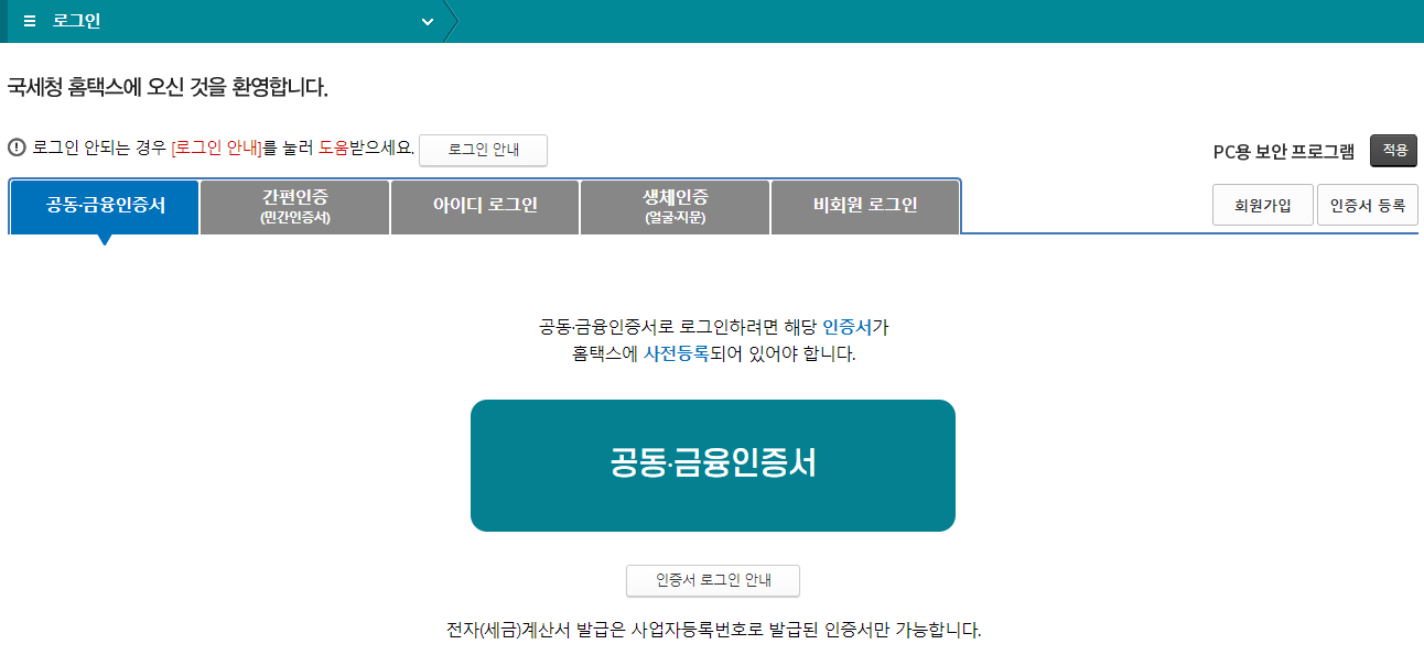 준비물은 국세청 홈텍스에 로그인 할 수 있는 공동인증서나 금융인증서 등입니다.