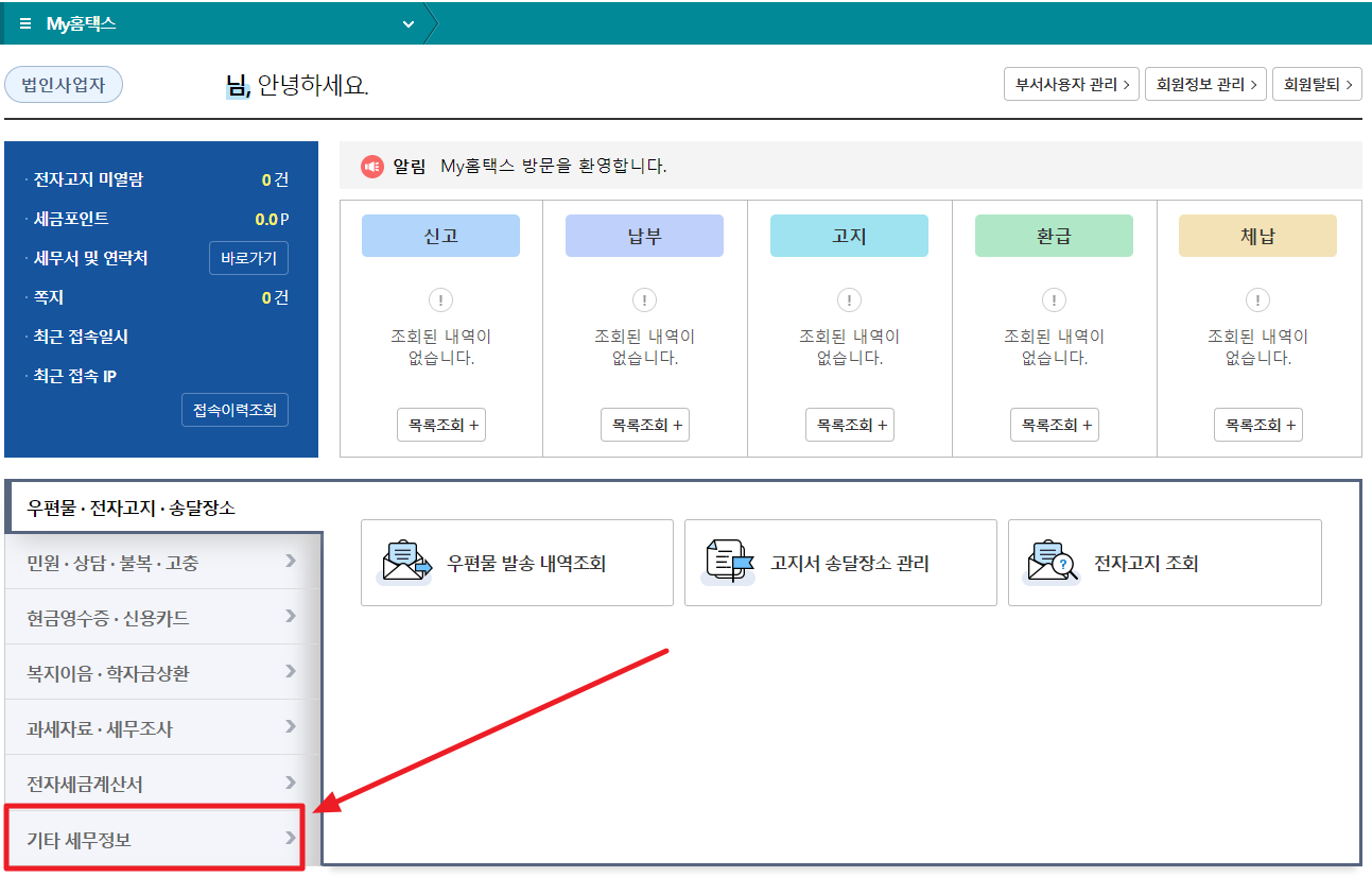 'My홈텍스' 메뉴화면에서 왼쪽 메뉴들 중 '기타 세무정보'를 선택합니다.