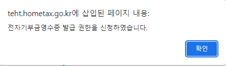 정상적으로 과정을 마쳤다면 '전자기부금영수증 발급 권한을 신청하였습니다.' 라는 팝업창이 뜹니다.