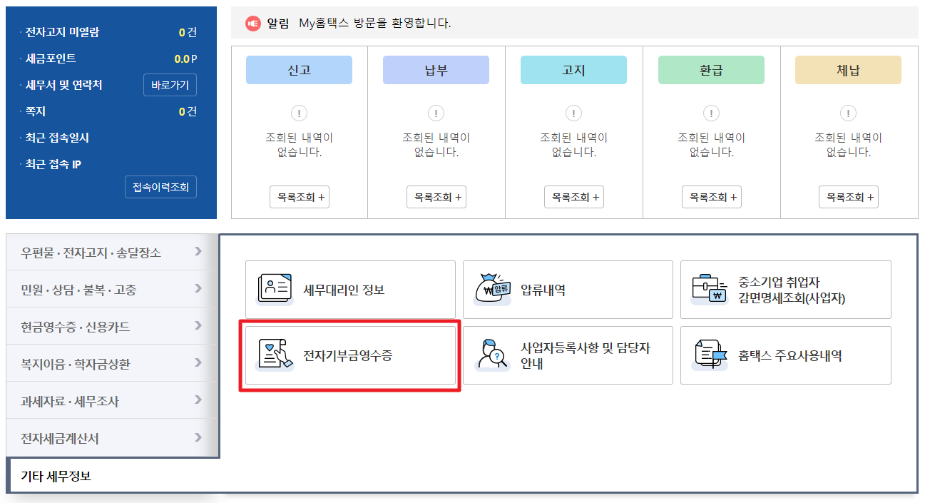 로그인 > My홈텍스 > 기타 세무정보 > 전자기부금영수증