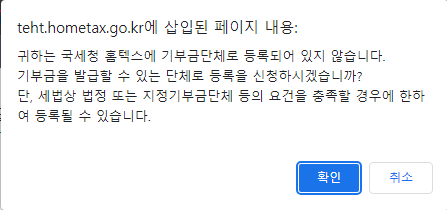 '귀하는 국세청 홈텍스 기부금단체로 등록되어 있지 않습니다. 기부금(영수증)을 발급할 수 있는 단체로 등록을 신청하시겠습니까? 단, 세법상 법정 또는 지정기부금단체 등의 요건을 충족할 경우에 한하여 등록될 수 있습니다.' 라고 안내창이 뜹니다.