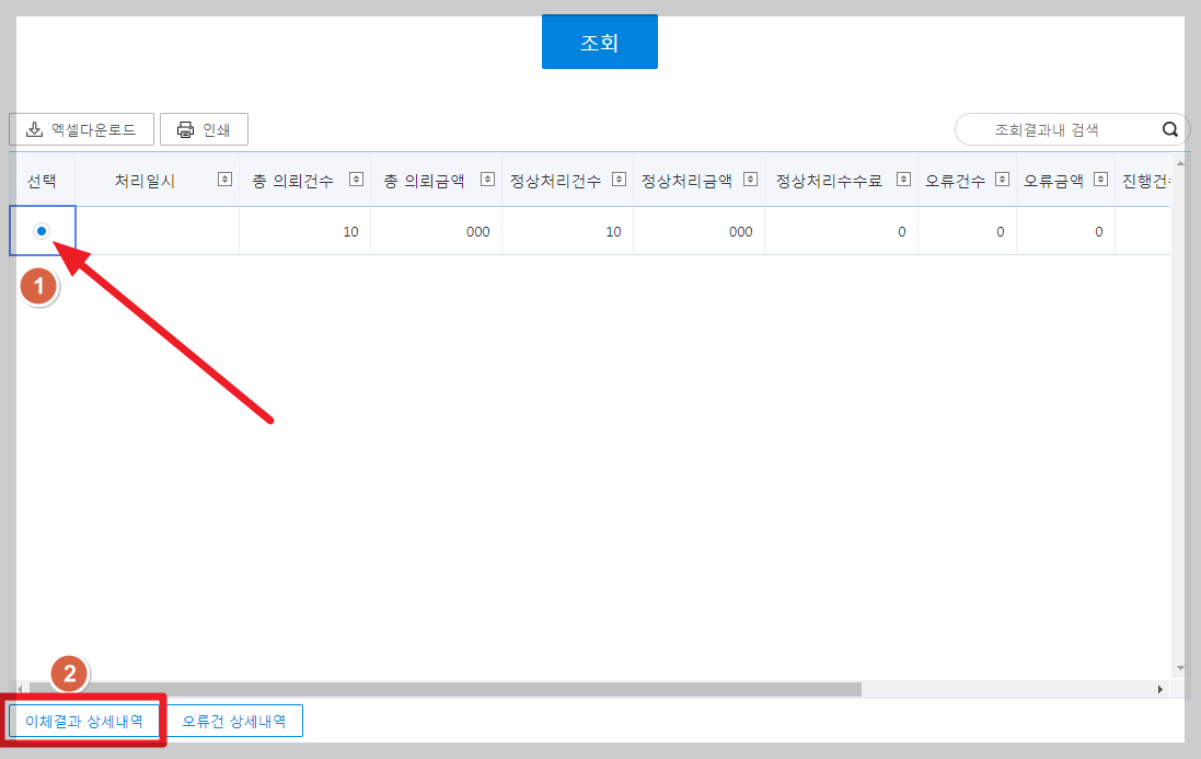 총 의뢰건수, 총 의뢰금액, 정상처리 건수, 정상처리금액, 수수료, 오류 건수, 오류 금액 등의 정보를 확인할 수 있습니다.