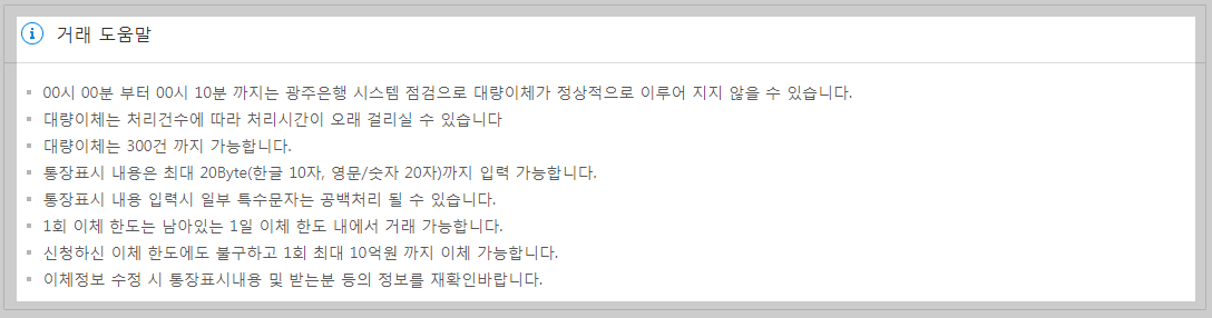 광주은행 대량이체를 위한 기본적인 정보이니 알아두시기를 바랍니다.