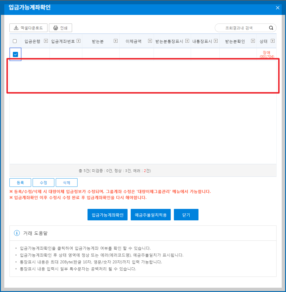 입금가능 계좌 확인을 실행하면 이상없는 이체 건은 제외되고 계좌이체가 불가능한 건들만 목록에 나타납니다.