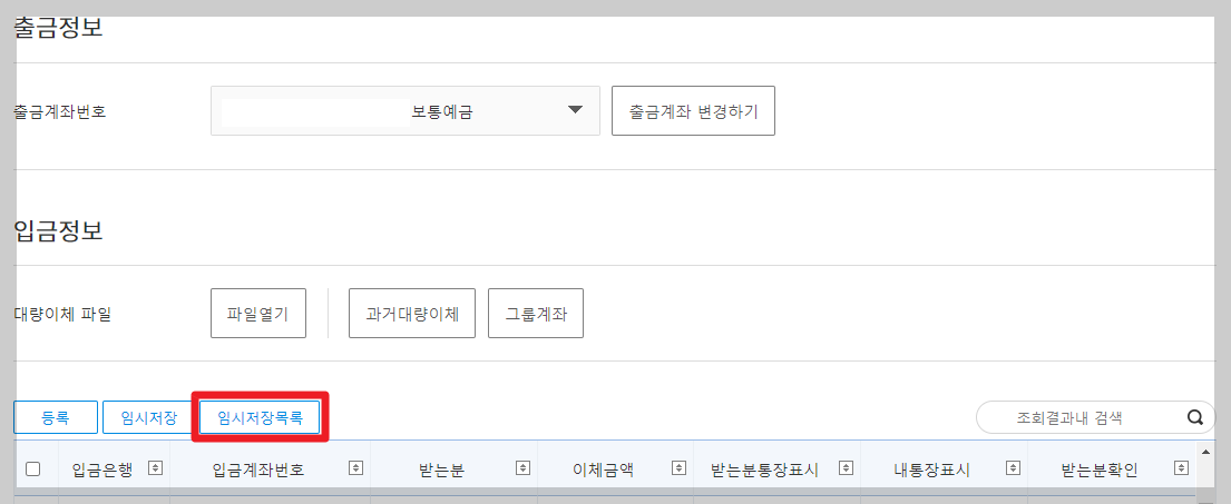 출금정보 화면에서 '임시저장목록'을 선택하면 임시저장된 목록을 확인할 수 있습니다.