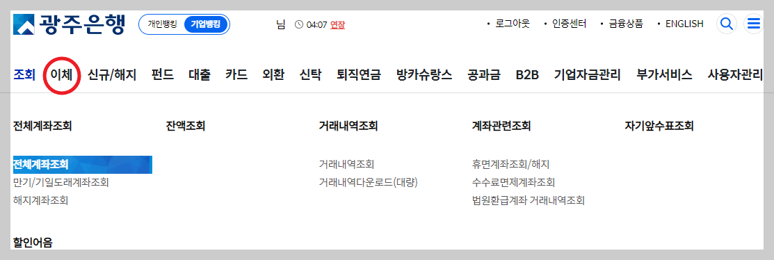 이들 중에서 대량이체 아래에 있는 대량이체 메뉴로 커서를 조심히 이동하여 선택합니다.