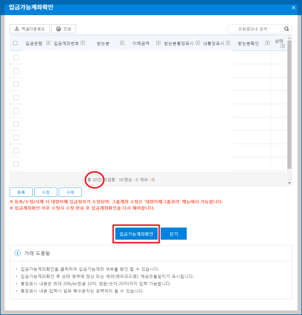 대량이체를 위해 작성해 놓은 파일을 선택하면 아래처럼 입금가능 계좌확인 화면이 열립니다.