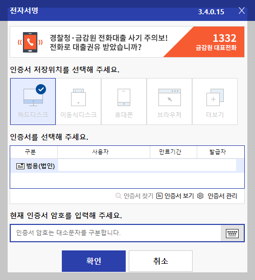 저장된 경로를 찾아 로그인에 사용하려는 인증서를 선택하고 인증서 암호를 정확하게 입력 후 확인을 선택합니다.