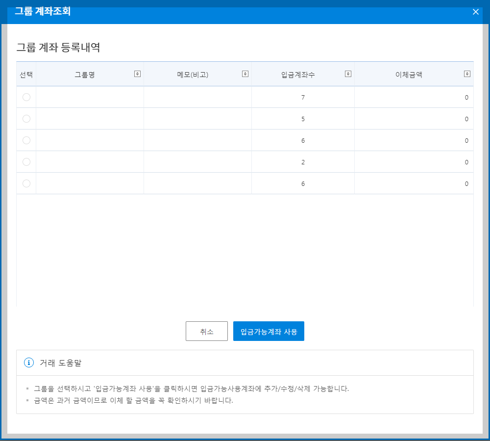 여러 건들을 묶어서 이체하는 경우가 반복될 때, 미리 대량이체 건들을 그룹으로 등록하여 활용할 수도 있습니다.