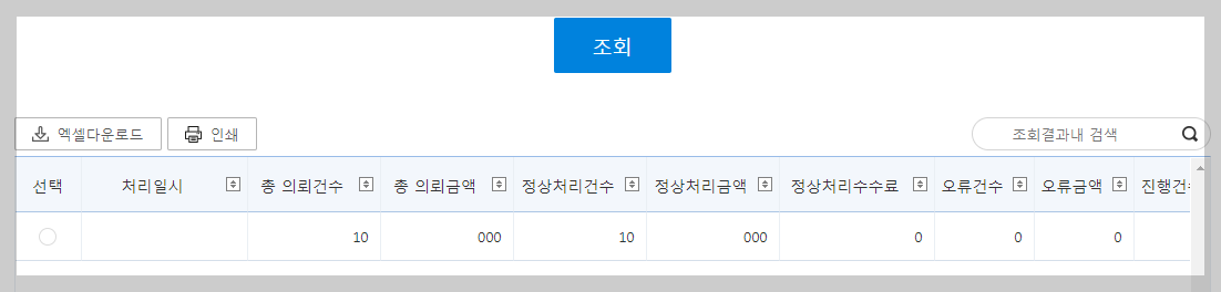 총 의뢰건수, 총 의뢰금액, 정상처리 건수, 정상처리금액, 수수료, 오류 건수, 오류 금액 등의 정보를 확인할 수 있습니다.
