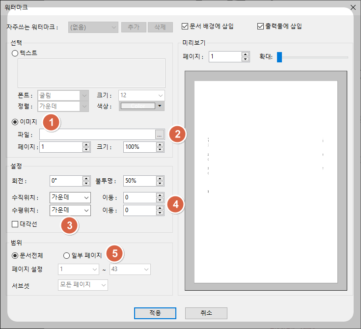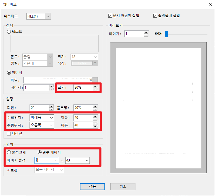 기존에 삽입하였던 워터마크 이미지의 경로와 크기 수직위치, 수평위치 범위 등을 수정한 후 적용하면 워터마크 편집 내용이 PDF 문서에 전체적으로 한번에 적용됩니다.
