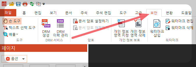 PDF 문서에 워터마크로 원본대조필 넣기를 하려면 주메뉴에서 '보안' 을 선택합니다.