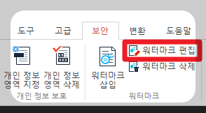 워터마크 삽입 후 수정이 필요할 때 보안 하위 워터마크 편집 메뉴에서 진행합니다.